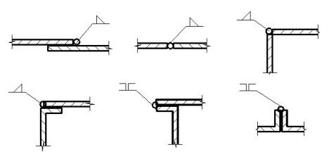 壁厚大于1.2mm的風(fēng)管與法蘭連接可采用連續(xù)焊或翻邊斷續(xù)焊。管壁與法蘭內(nèi)口應(yīng)緊貼,焊縫不得凸出法蘭端面,斷續(xù)焊的焊縫長(zhǎng)度宜在30~50mm,間距不應(yīng)大于50mm。 圖3. 2.1 焊接風(fēng)管焊縫位置